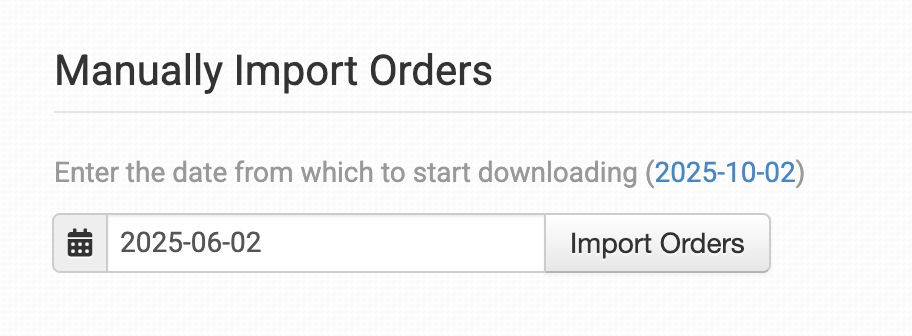 Enter the date from which you'd like to start the download process, then click the Import Orders button. If there are more than 50 orders from that date, you might need to click the Import Orders button a couple more times to bring them all in.