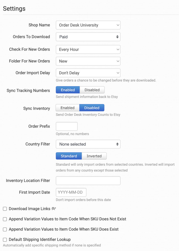 If you need to add a prefix to your Etsy orders as they are downloaded to Order Desk, set that here.