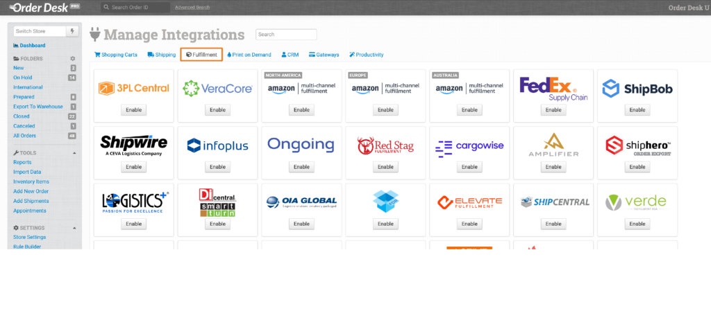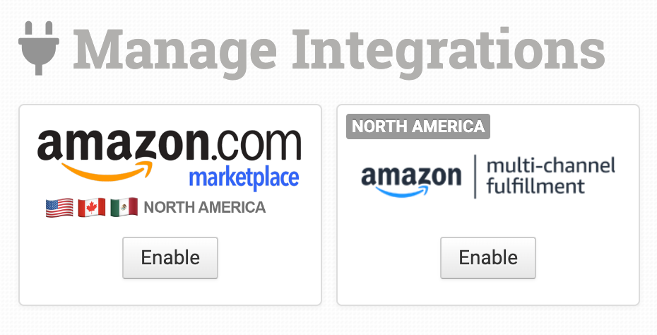 To enable Amazon MCF, click on Manage Integrations under the Integrations menu in the left sidebar: