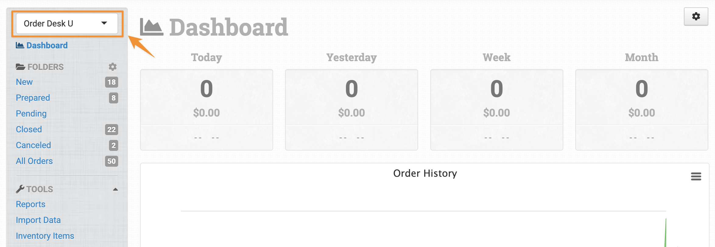 Create as many stores as you need, giving them names that are easy to identify. Once you have more than one store in Order Desk, you can quickly switch between your stores by choosing the store name from the dropdown at the top of the left sidebar.