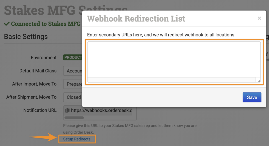 If you have Stakes MFG connected to more than one Order Desk store for the same account, instead of adding the notification URL for each connection to Stakes MFG, add any additional notification URLs from other connections to your primary Order Desk store. Add one URL per line.