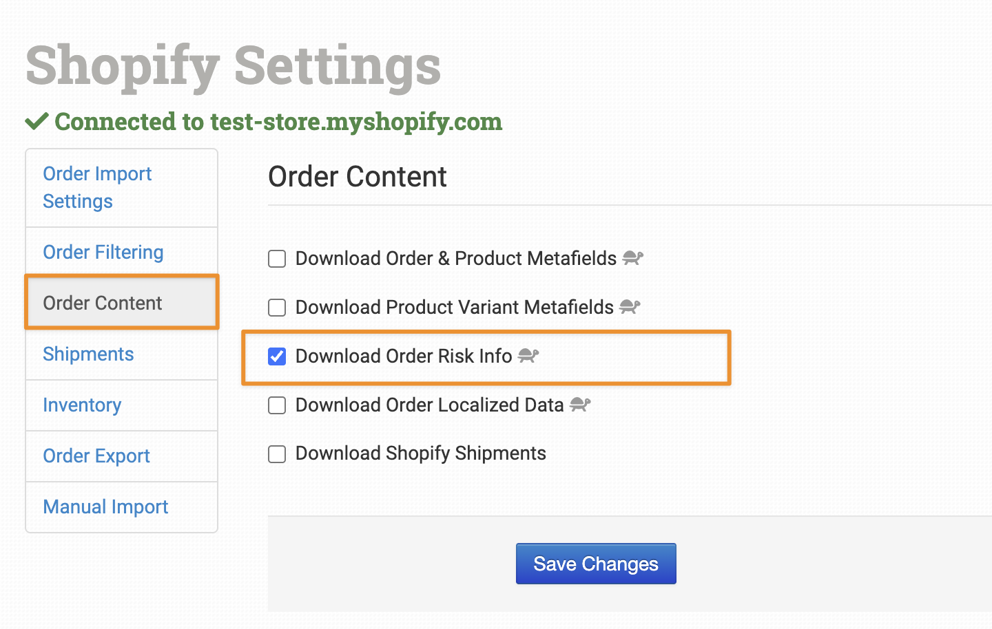 Head into the Order Content tab and enable the Download Order Risk Info option.
