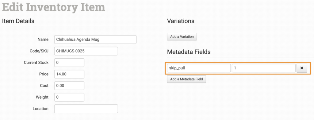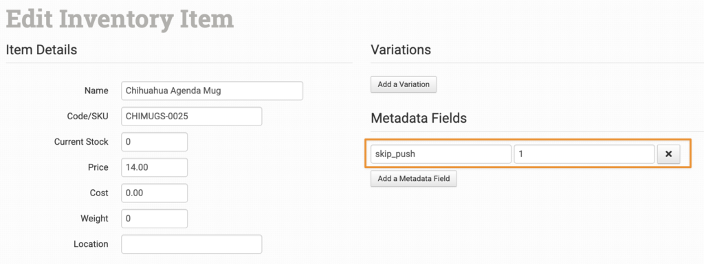 Items with skip_push added will not receive any inventory updates from Order Desk when the inventory in your shopping cart is updated.