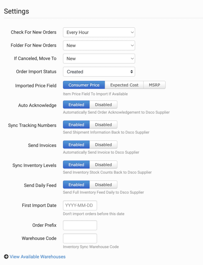 Click this link to view your available warehouse names as well as their Warehouse Code, Dsco ID, and Supplier ID.