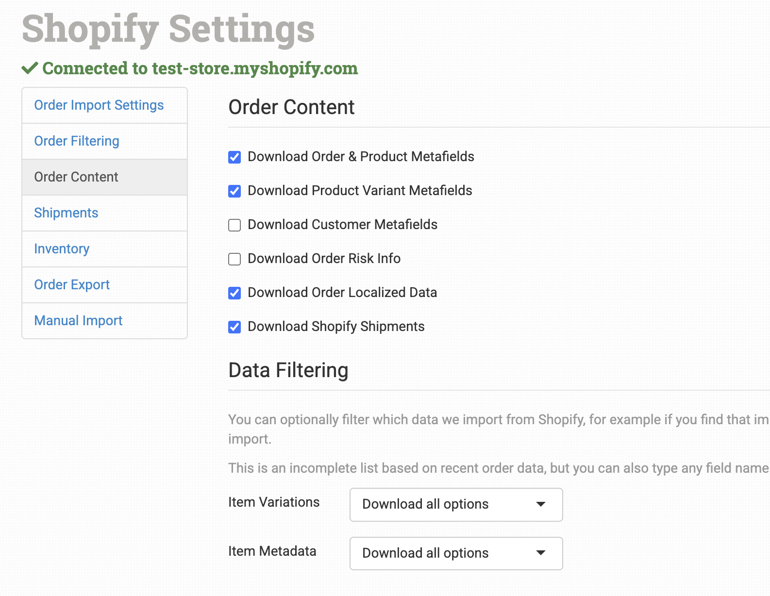 Please keep in mind that downloading these metafields can increase the amount of data being sent through the API. This can prevent some orders with more fields from being downloaded if they exceed Shopify's rate limits.