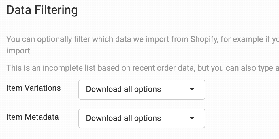 You can optionally filter which order item data we import from Shopify. This is especially useful if you find that important data is being skipped because your order items have too much data to import at once. These can be set for both Item Variations and Item Metadata: