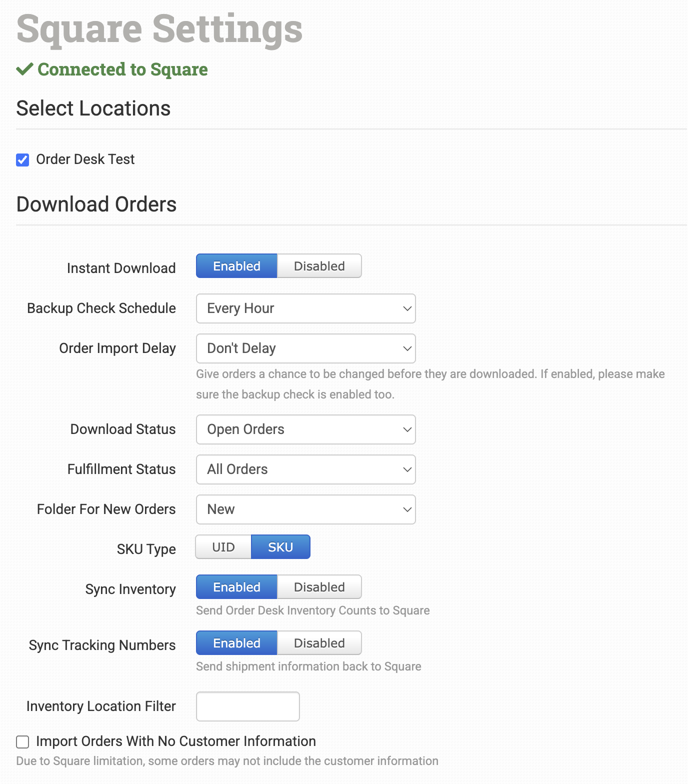 The inventory location name must match exactly as it is on your inventory items in Order Desk. When importing new orders from Square, Order Desk will look at the SKUs on the items and compare to the SKUs in your inventory here. Any orders with items for a location that isn't listed in this field will not be imported.