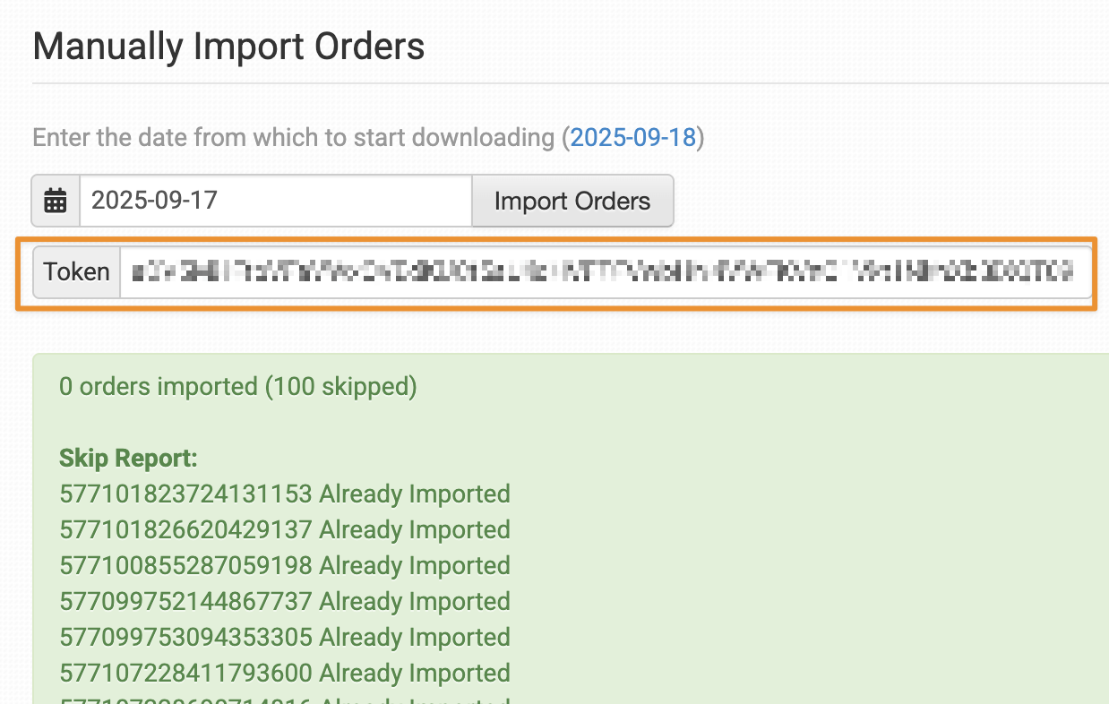 The Import Orders button downloads orders in batches of 100 at a time. If there are more orders to download, a Token option will appear.