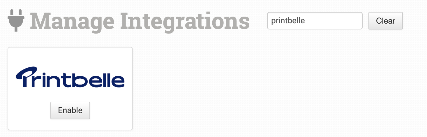 To connect to Printbelle, click on Manage Integrations in the left sidebar. Under the Print on Demand tab, find and click to enable the Printbelle integration.