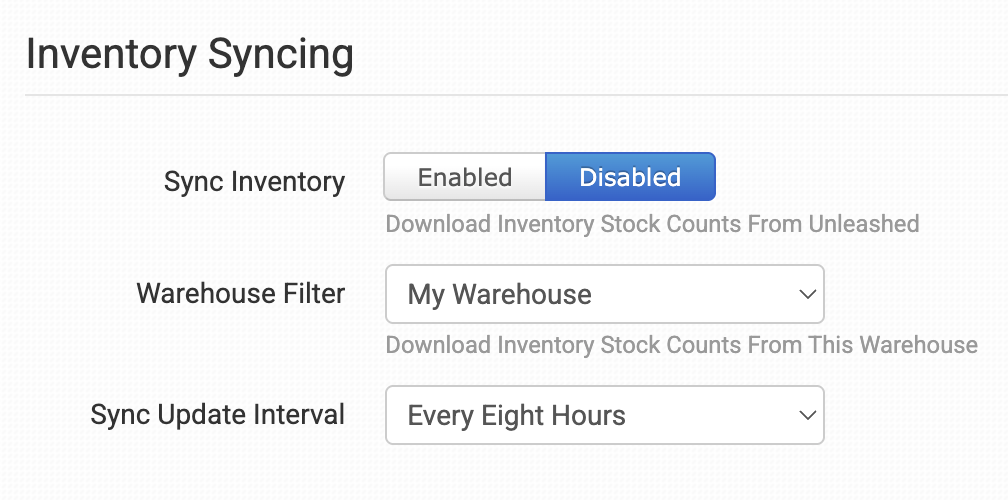 If Sync Inventory is enabled, you can use this to choose how often you want Order Desk to check Unleashed for inventory updates.
