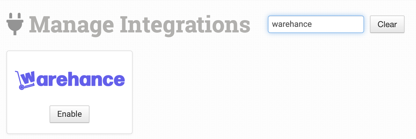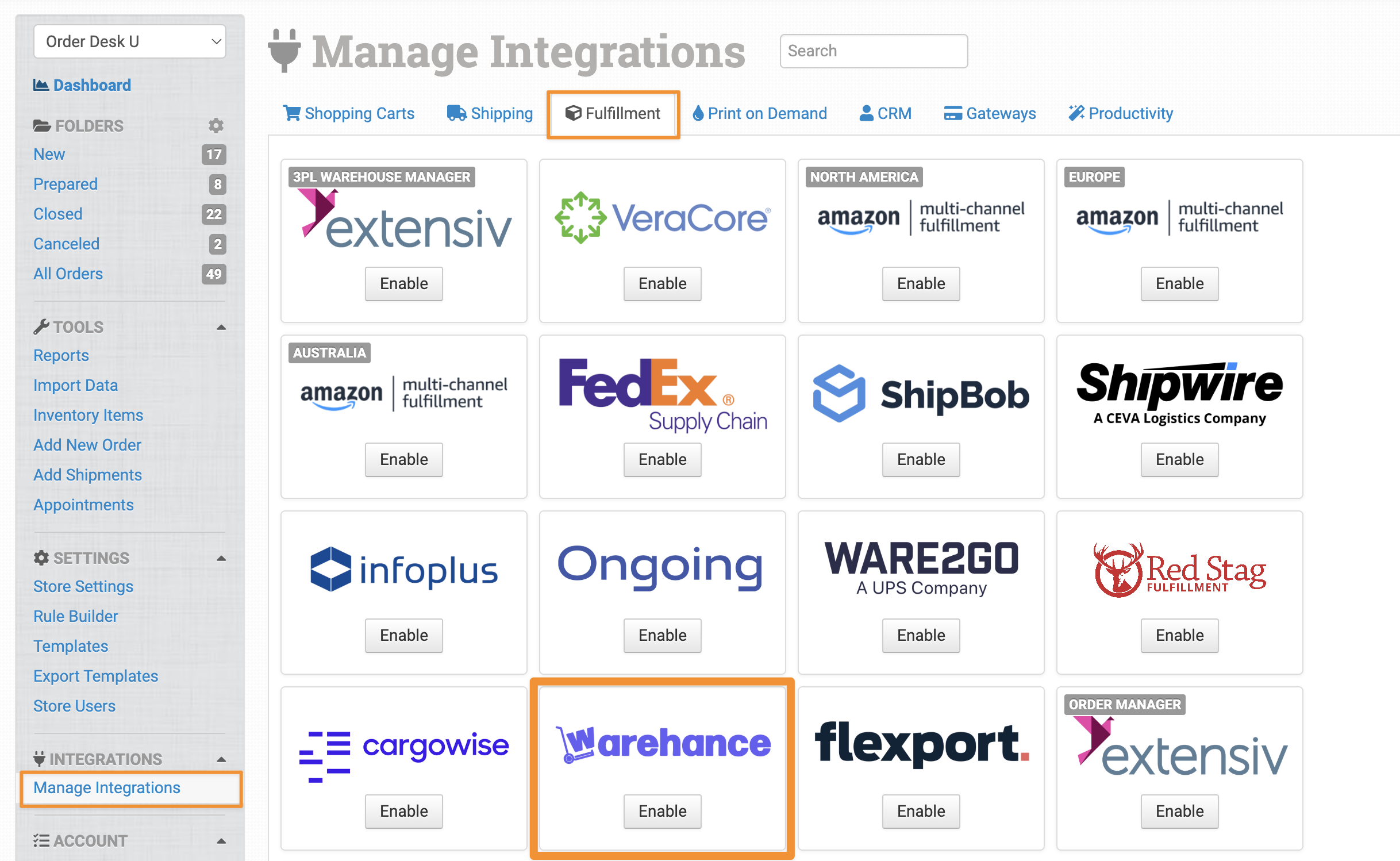 To connect to Warehance, click on the Manage Integrations link in the left sidebar and under the Fulfillment tab find and enable the Warehance integration:
