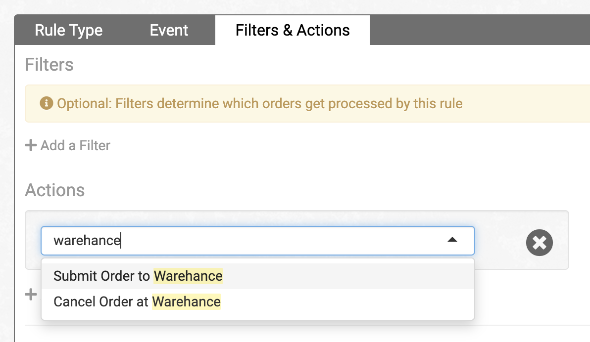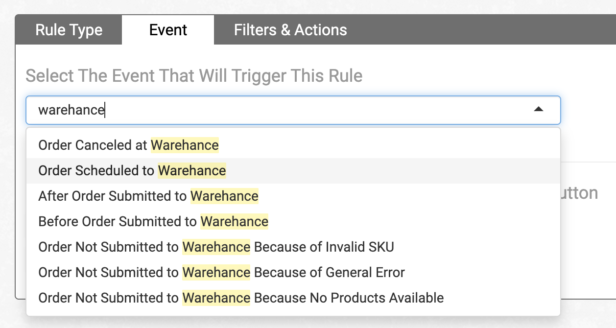 In addition to the general rule events available for all orders, the following events are specific to Warehance. To find them, type Warehance in the Event dropdown menu in the Rule Builder: