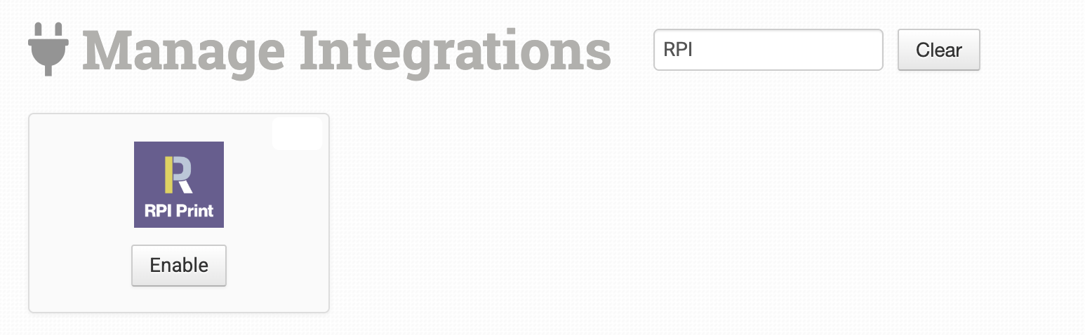 To connect to RPI Print, click on Manage Integrations in the left sidebar. Under the Print on Demand tab, find and click to enable the RPI Print integration.