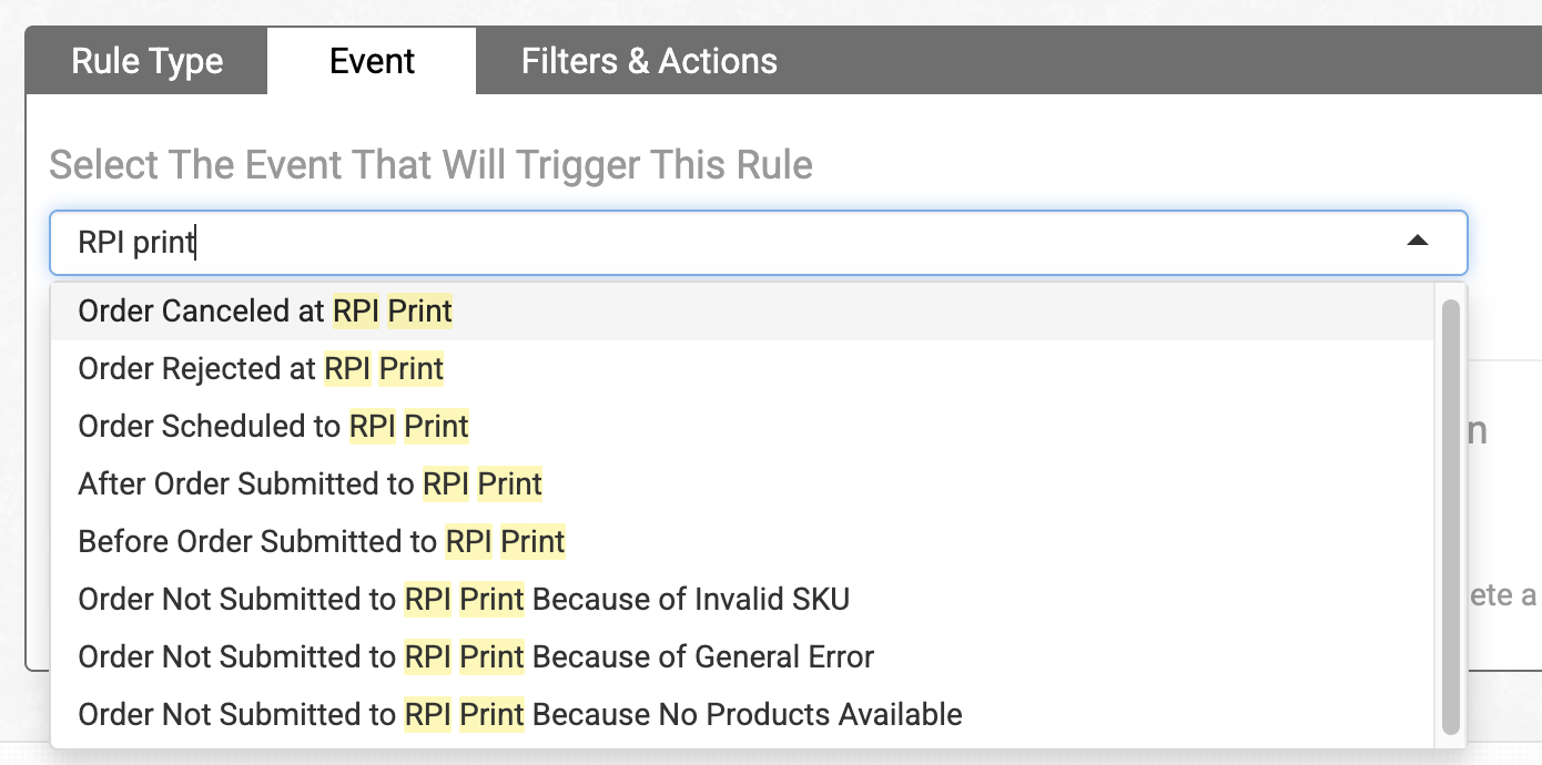 The following events are specific to RPI Print. To find them, type RPI Print in the Event dropdown menu in the Rule Builder: