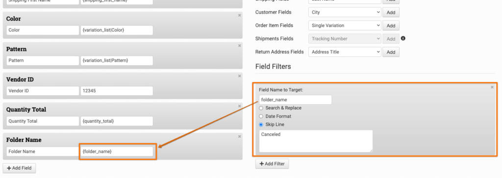 You can even export all of your orders from Order Desk, but skip any that are in a specific folder. Make sure the folder is one of the fields in the template, then target that field, folder_name, and add the name of the folder you want left out of the file, for instance “Canceled”: