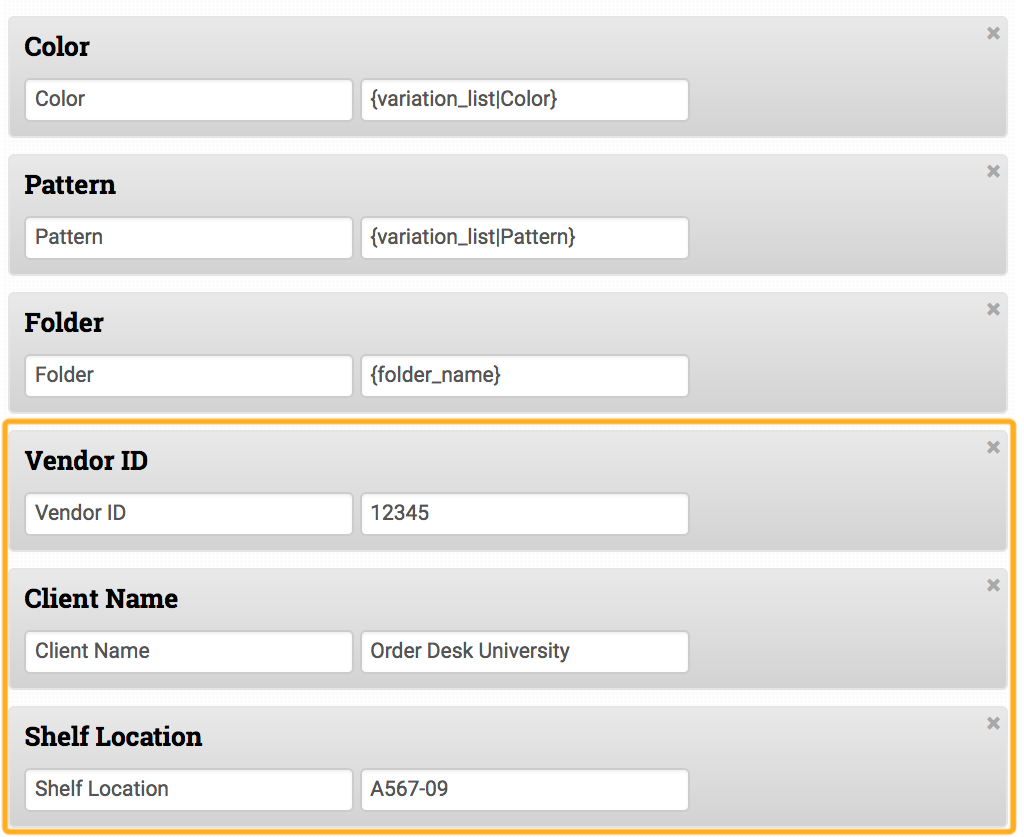 Unlike Order Desk field names, with curly brackets around them, that pull specific information from each order to use in the exported file, these will be exported exactly as you write them in the template: