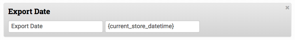 You can export your store’s current datetime, applied to each row in the file when the template is exported, by using the field {current_store_datetime}. The format will use the default Y-m-d H:i:s.