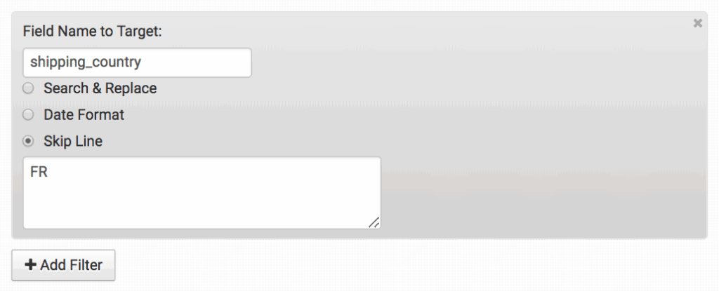 This can be used for any field name in your template as long as you have a specific value that you want to skip. Another example is to export all orders except any with a specific shipping country, such as France: