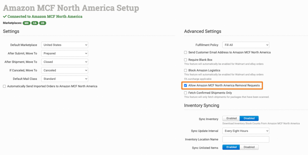 To request inventory be removed from MCF’s warehouse system, Allow Amazon MCF Removal Requests in the MCF integration settings must be enabled.