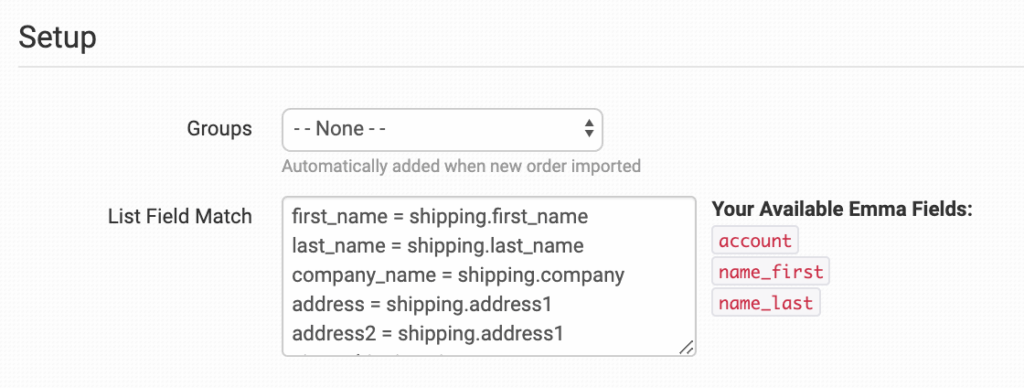Use the List Field Match to send specific order data from Order Desk into your fields in Emma. The Emma field names should be lower case, and spaces or slashes should be replaced with underscores.