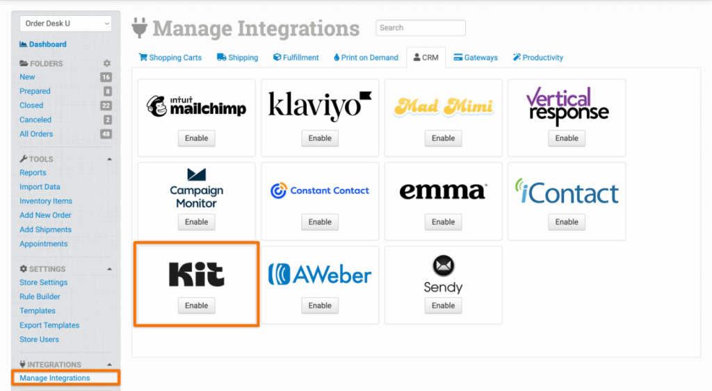 To enable the integration, click on Manage Integrations in the left sidebar. Under the CRM tab, find and enable the Kit integration.