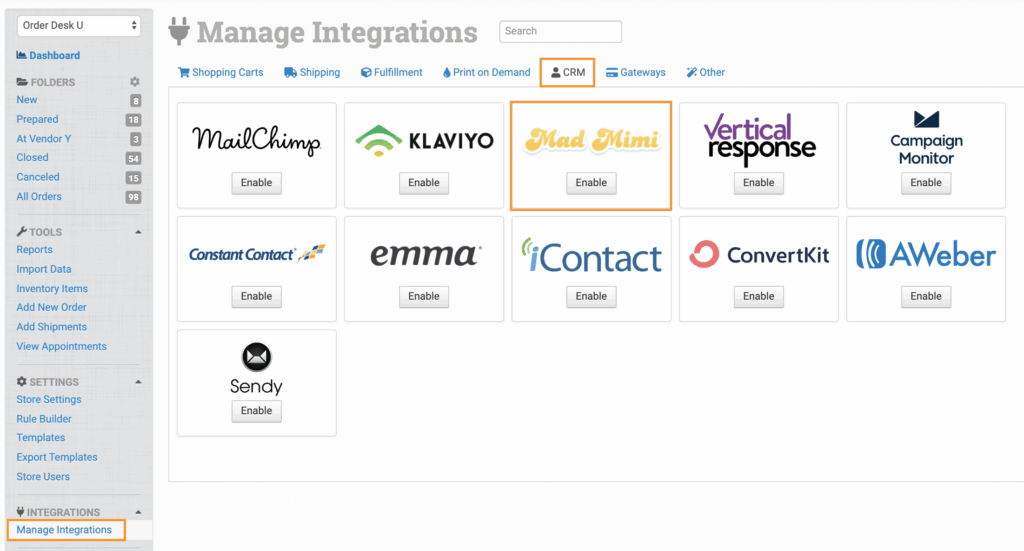 To enable the integration, click on Manage Integrations in the left sidebar. Under the CRM tab, find and enable the Mad Mimi integration.