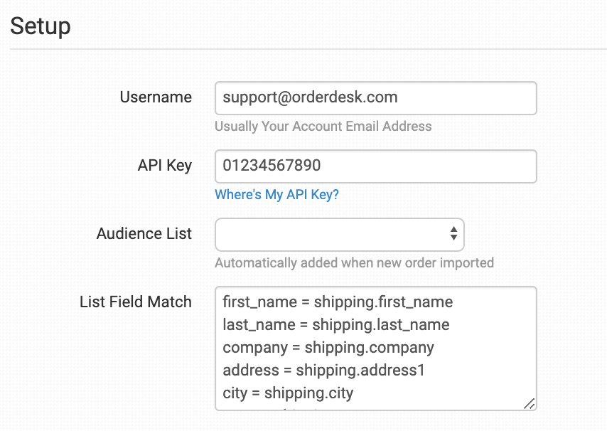 Enter your Username and API Key from Mad Mimi to connect to Order Desk. You can find your API Key at Mad Mimi by following these steps.