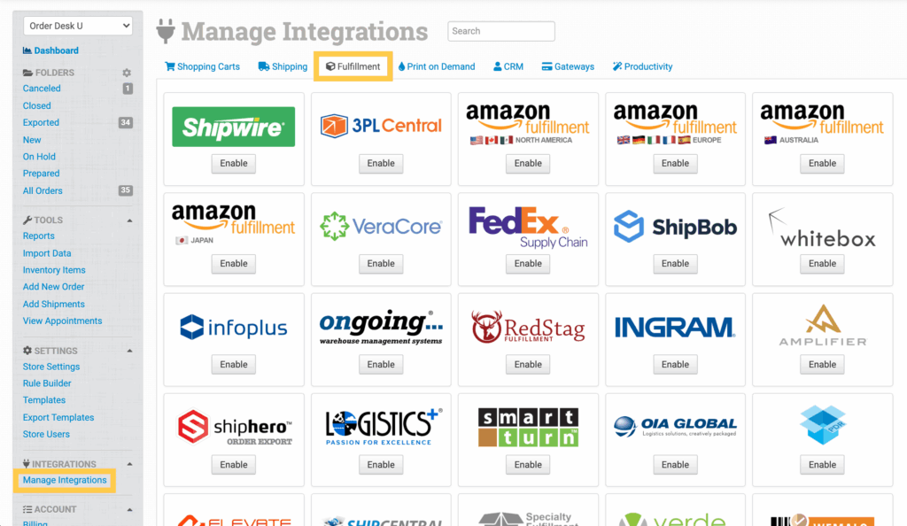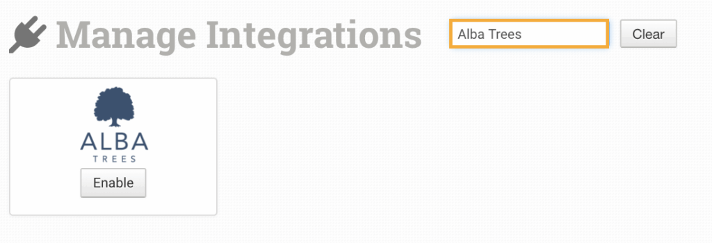 To connect the Alba Trees integration, click on the Manage Integrations link in the left sidebar and under the Fulfillment tab find and enable Alba Trees.