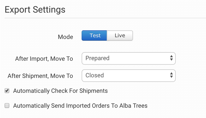 Select Test when sending test orders through to Alba Trees. When ready to send live orders, switch this to Live.