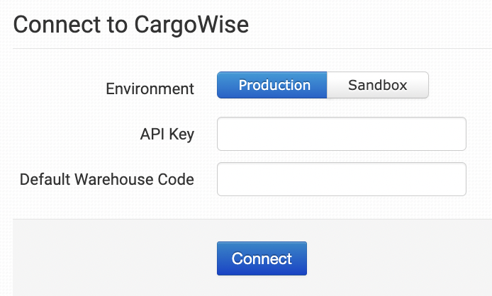 Once enabled, select the environment you would like to enable (Production for live orders, Sandbox for testing), enter your API Key and Default Warehouse Code provided to you by Logistics Plus, then click Connect.