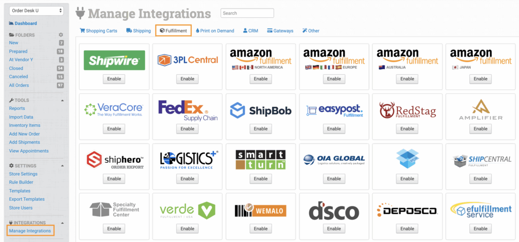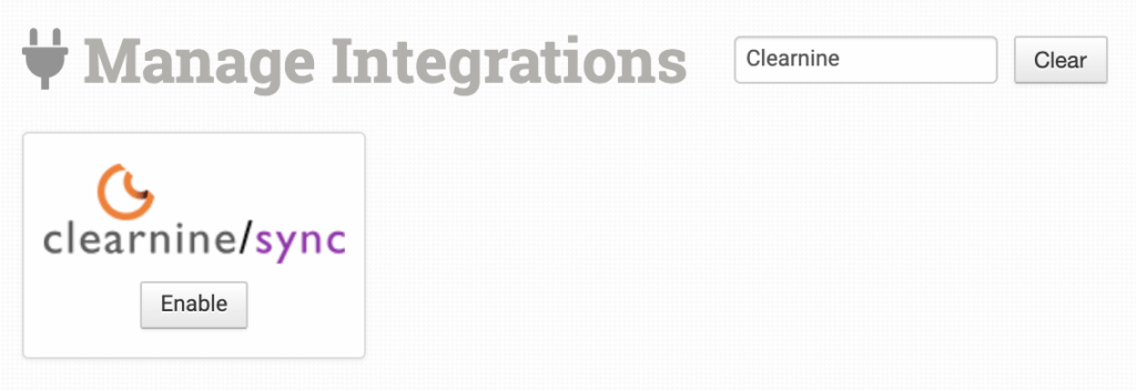 To connect to Clearnine, click on the Manage Integrations link in the left sidebar and under the Fulfillment tab find and enable the Clearnine integration.