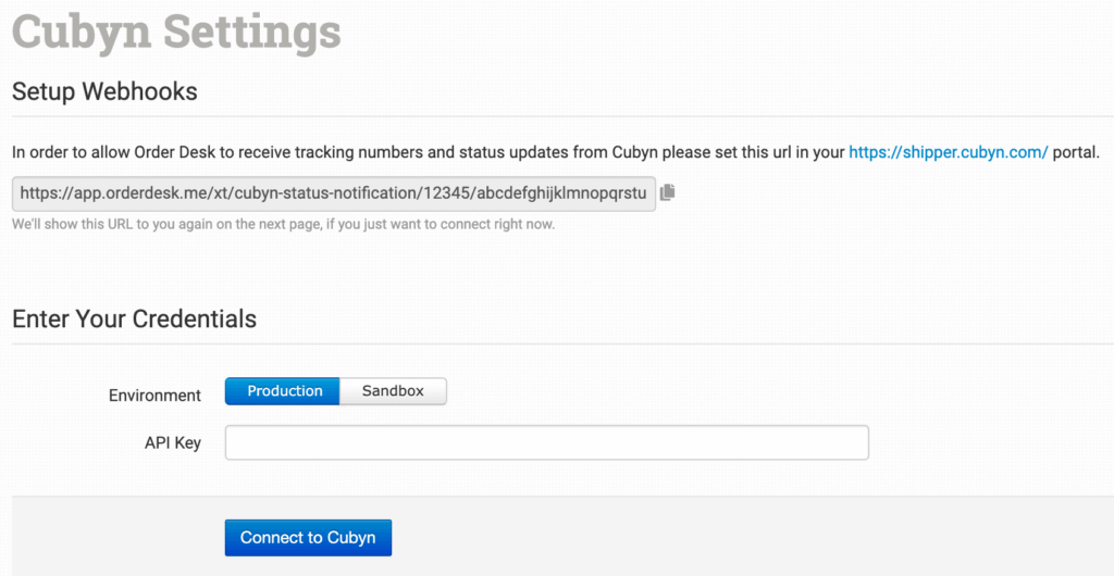 If you skipped this step when connecting the integration, add this webhook URL to your Cubyn account. This is necessary for Cubyn to be able to send shipment notifications back into your orders in Order Desk.