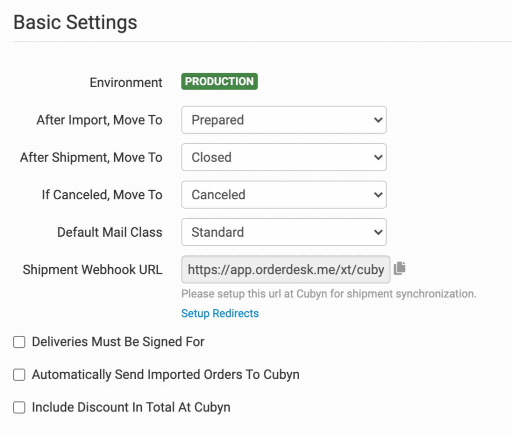 If you connect the same Cubyn account to more than one Order Desk store, you will need to setup some redirects so when the shipment info comes back from Cubyn, it will find its way to the right Order Desk store.