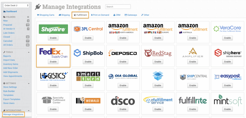 To connect to FedEx Supply Chain, click on the Manage Integrations link in the left sidebar and under the Fulfillment tab find and enable the FedEx Supply Chain integration.