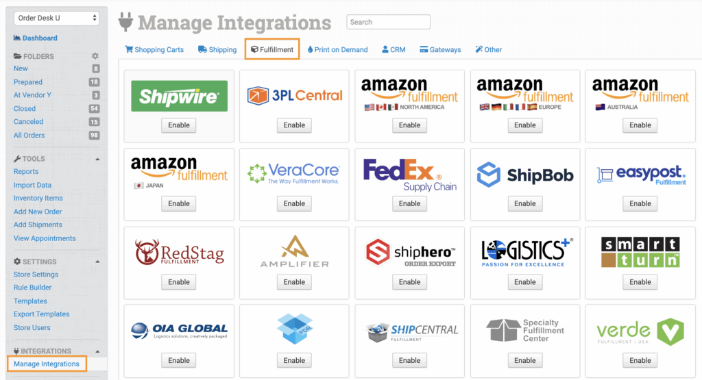 To connect the I-dika integration, click on the Manage Integrations link in the left sidebar and under the Fulfillment tab find and enable I-dika.