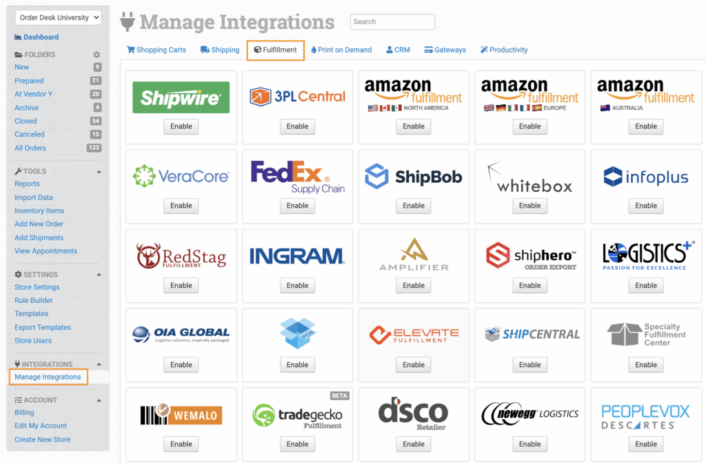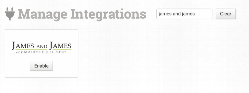 To connect the James and James integration, click on the Manage Integrations link in the left sidebar and under the Fulfillment tab find and enable James and James.