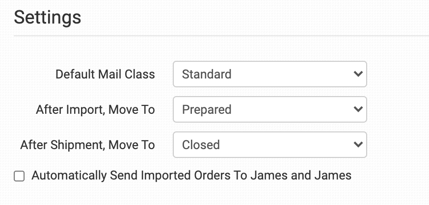 If the shipping methods you set up in your shopping cart(s) don’t match the shipping method names James and James uses, they won’t know what methods you intend for them to use. When this happens, the default mail class applied above will be used instead for all of your orders.