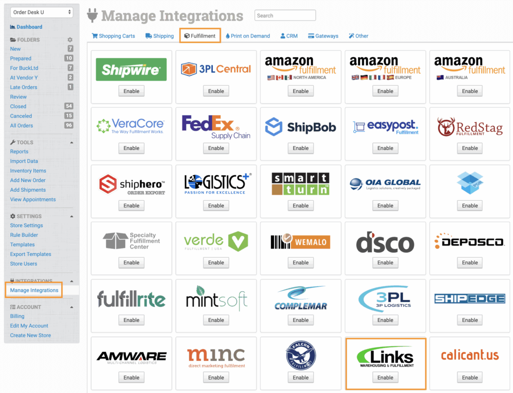 Under the Fulfillment tab, find and enable Links Warehousing & Fulfillment.
