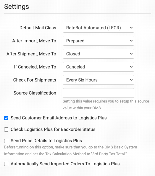 If you want to send your price details to Logistics Plus with your orders, select this. Before enabling this, please set Tax Calculation Method to 3rd Party Tax Total in the OMS Basic System Information.