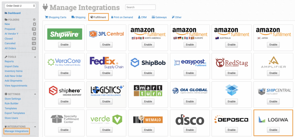 To connect the Logiwa integration, click on the Manage Integrations link in the left sidebar and under the Fulfillment tab find and enable Logiwa.