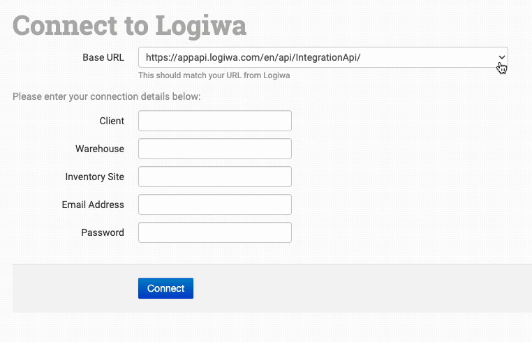 Once enabled, you’ll need to choose the correct Base URL, enter your Logiwa credentials, and click to connect.