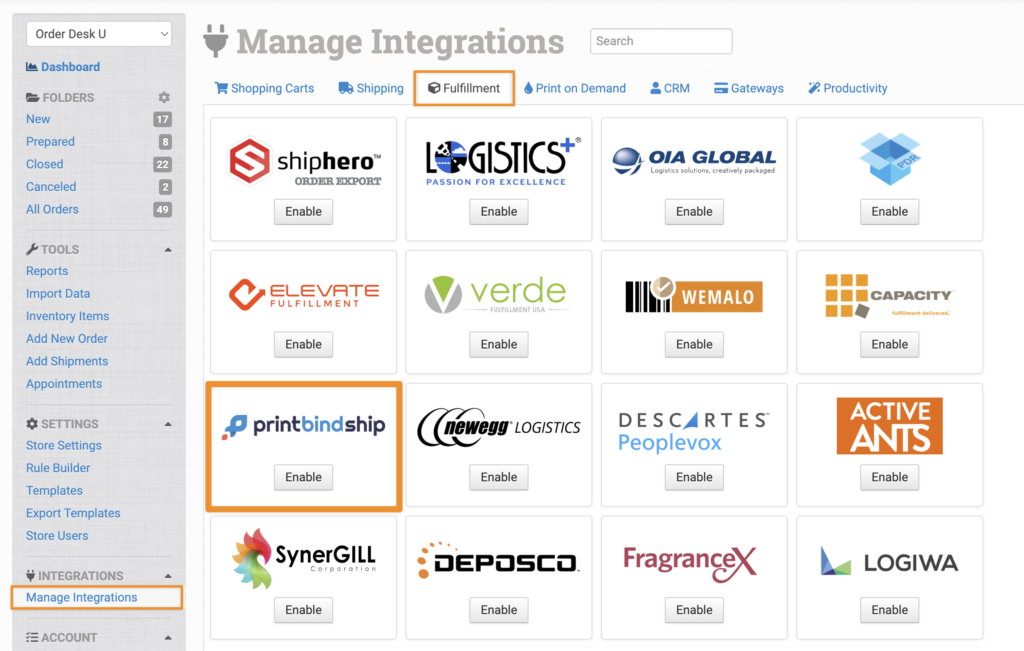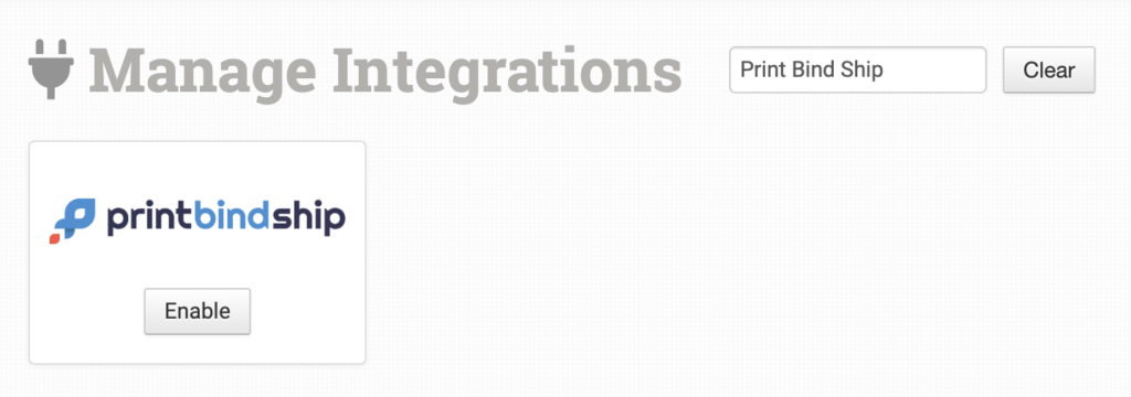 To connect to Print Bind Ship, click on the Manage Integrations link in the left sidebar and under the Fulfillment tab find and enable the Print Bind Ship integration.