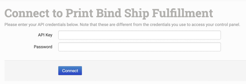 Once enabled, enter your Print Bind Ship API Key and Password and click to connect.