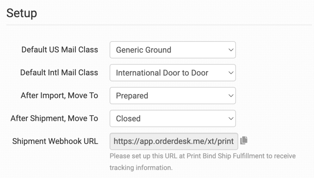 The Shipment Webhook URL is how Print Bind Ship tells Order Desk about your order shipments.