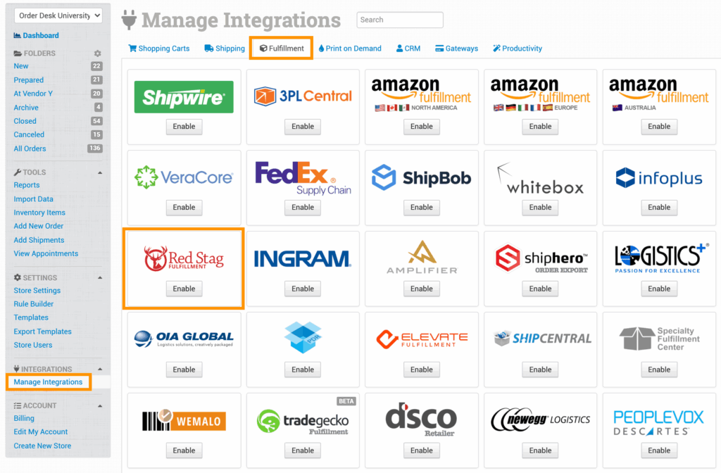 To enable the integration, click on the Manage Integrations link in the Integrations menu in the left sidebar. Under the Fulfillment tab, find and enable Red Stag Fulfillment.