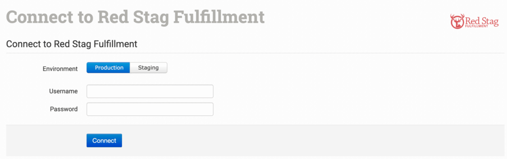 On the integration page, choose your preferred Environment (Production or Staging) and add your Red Stag Fulfillment username and password to connect.