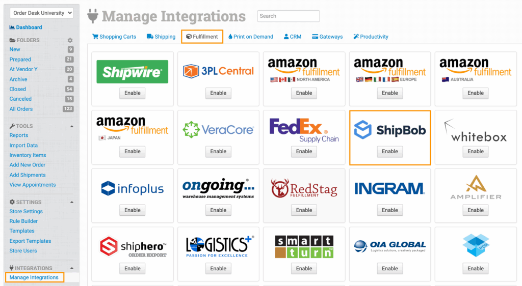 To connect to ShipBob, click on the Manage Integrations link in the left sidebar and under the Fulfillment tab find and enable the ShipBob integration.