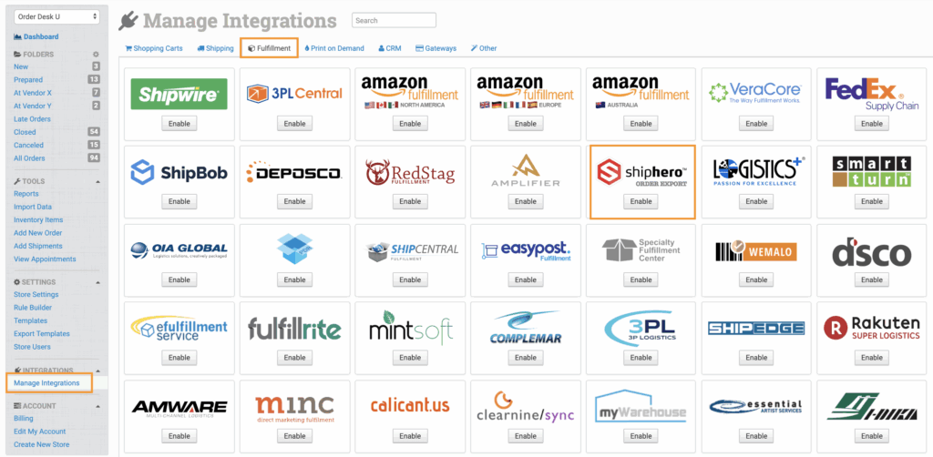 To connect to ShipHero, click on the Manage Integrations link in the left sidebar and under the Fulfillment tab find and enable the ShipHero Order Export integration.