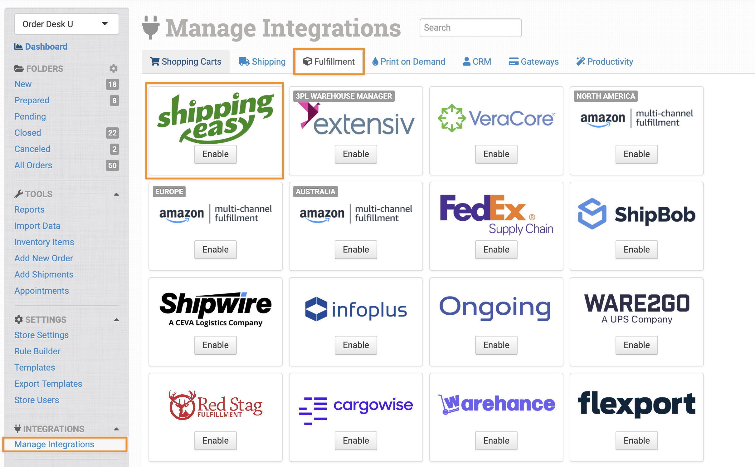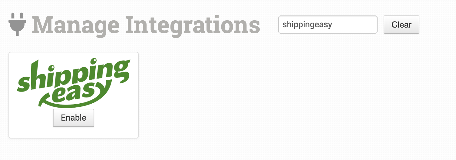 To connect to ShippingEasy, click on the Manage Integrations option in the left sidebar and, under the Fulfillment tab, find and enable the ShippingEasy integration.