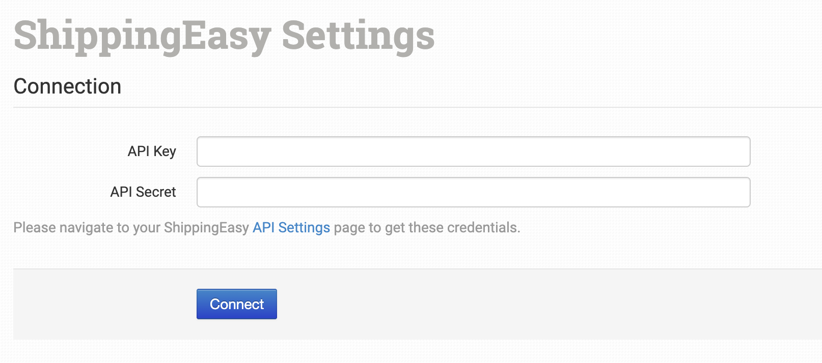 Once enabled, enter your ShippingEasy API Key and Secret, then click Connect.